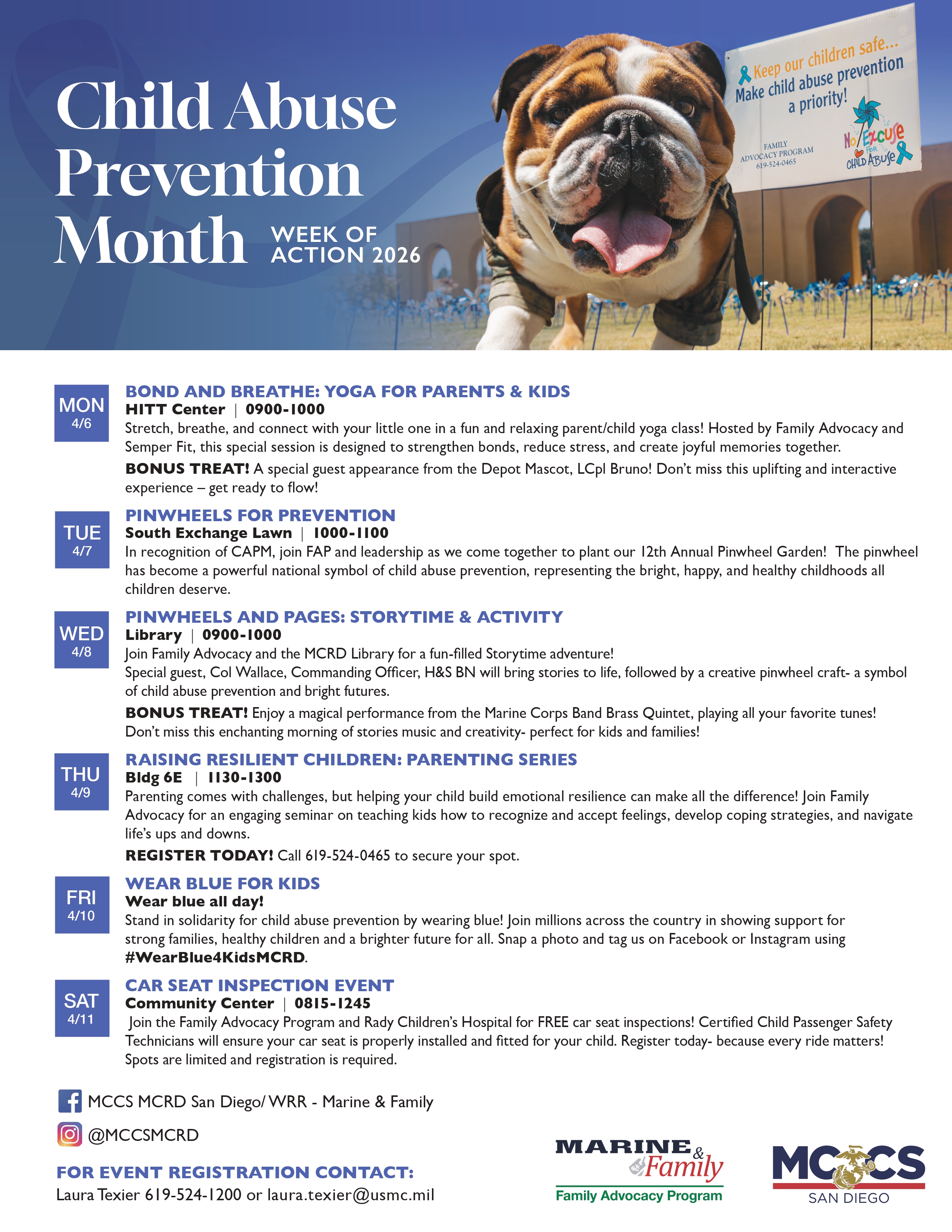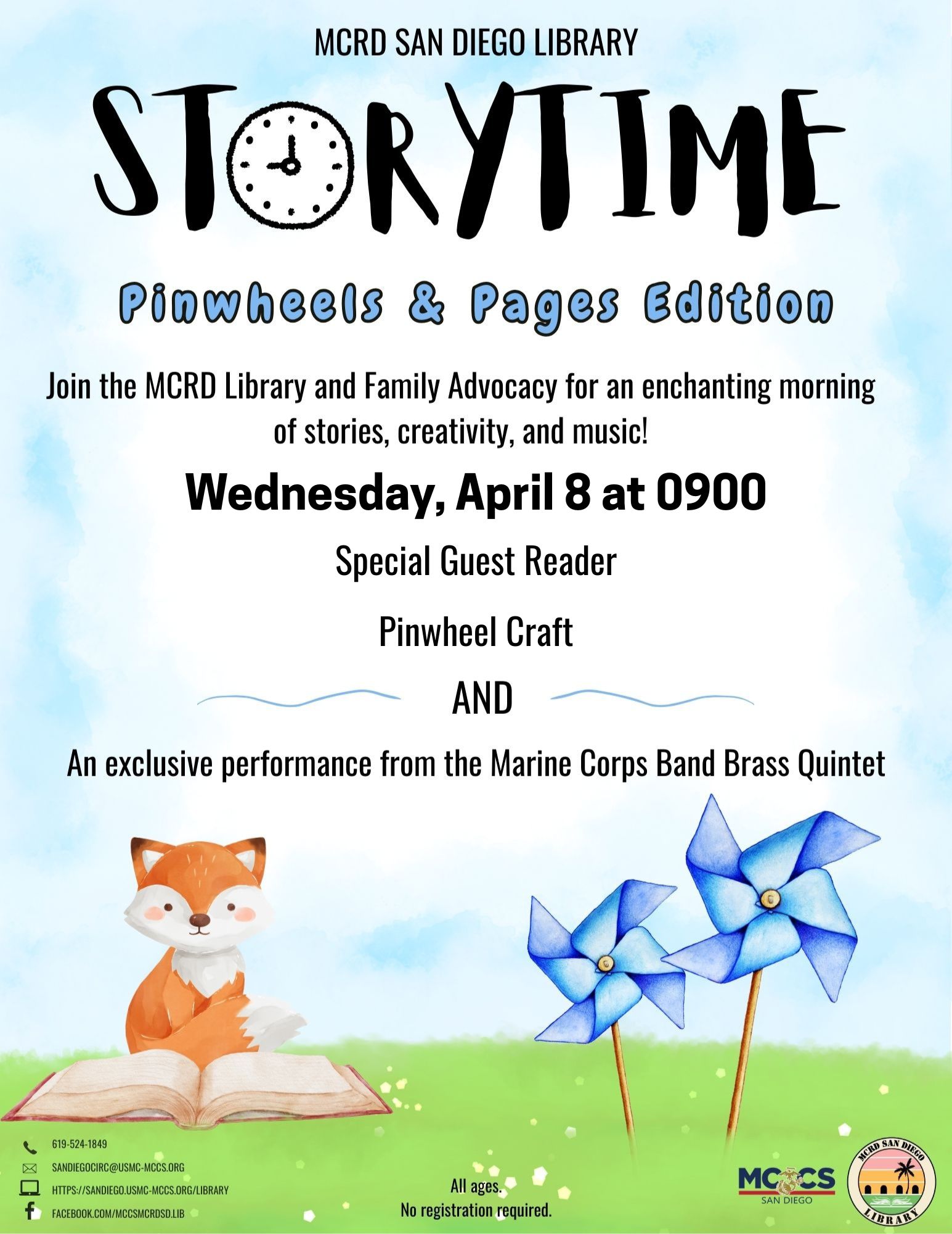 Join Family Advocacy and the MCRD Library for a fun-filled Storytime adventure! Special guest, Col Wallace, Commanding Officer, H&S BN will bring stories to life, followed by a creative pinwheel craft- a symbol of child abuse prevention and bright futures.
