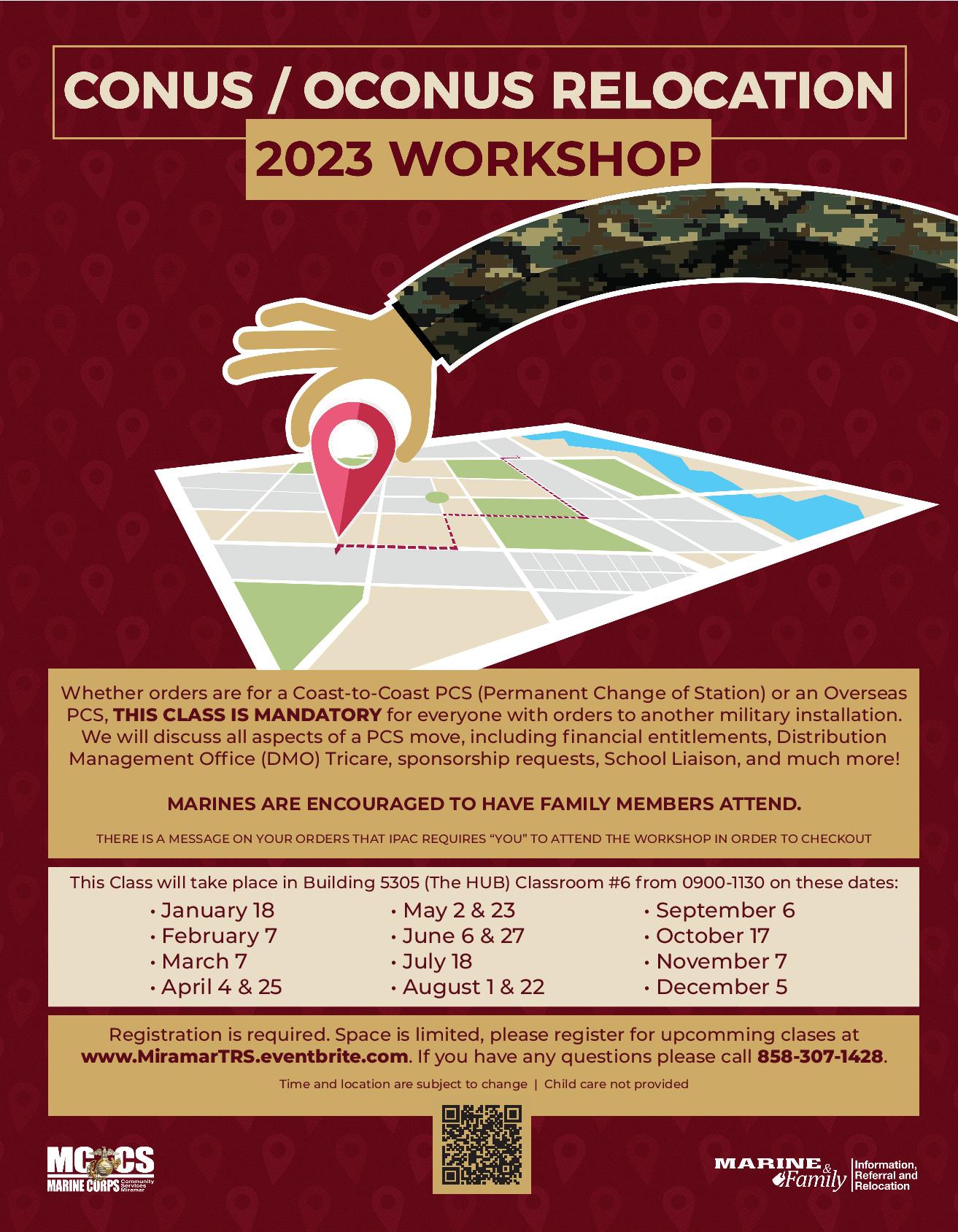 - Attend PCS Workshop: Marine and Family Services provides an abundance of information and resources on your next PCS relocation at Building 5305 (The HUB). Also, the workshop discusses all aspects of financial entitlements, Tricare, sponsorship requests, and much more. For registration visit www.MiramarTRS.eventbrite.com or call 858-307-1428 for more information.
