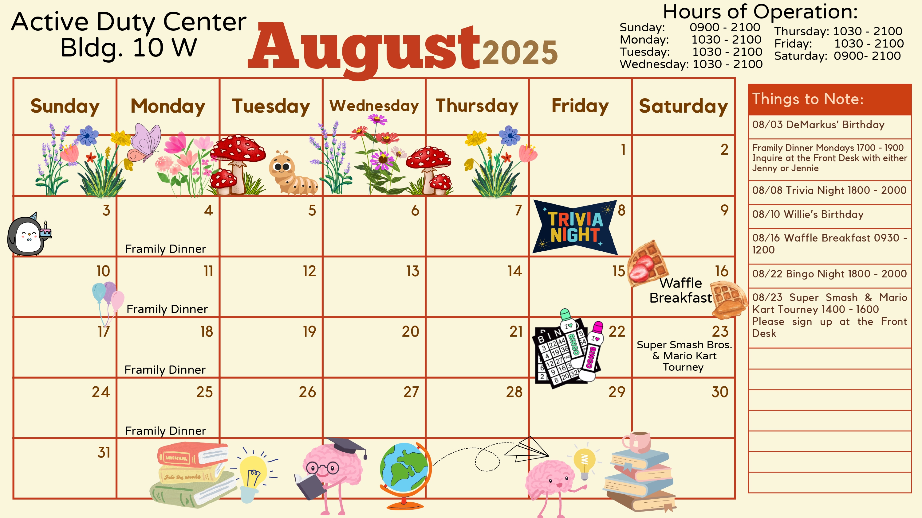The Active Duty Center provides a core space to include self-directed and directed recreational activity components to meet the needs of both Active-Duty personnel and the Single Marine population. We offer a wide range of amenities, including a kitchen, computer room, movie theater, a dedicated gaming room, and comfortable lounge areas equipped with pool tables, ping pong, and big-screen TVs.